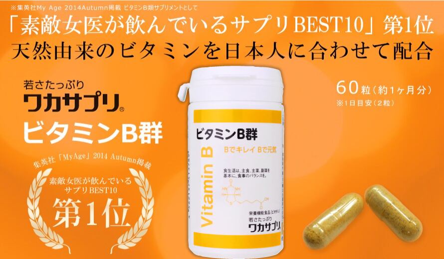 ワカサプリビタミンB群は、毎日の健康のためにしっかりとビタミンB群を補いたい方のために、信頼のおける原料を使用し高配合を実現いたしました。
