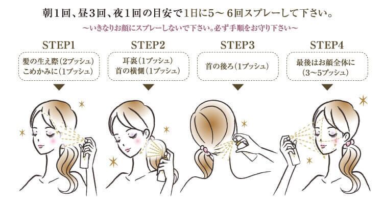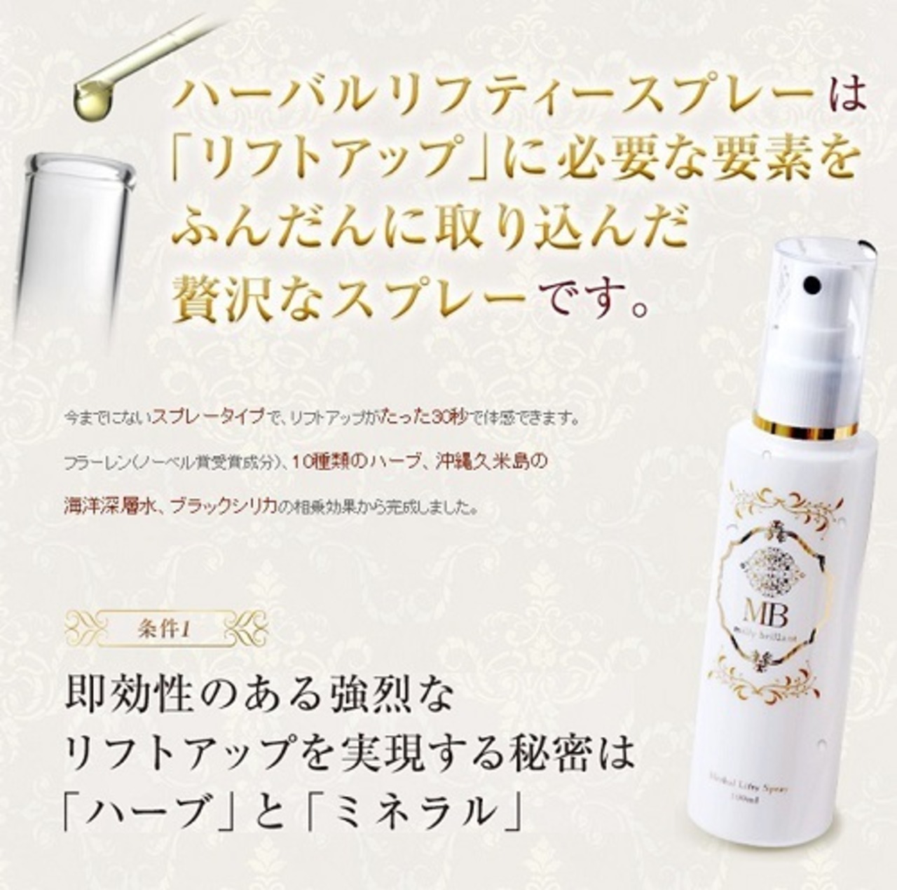 30秒でリフトアップ! 顔にハリ、引き締め、艶がよみがえるスプレー。 分子町が細かく、メイクを通り越して肌の奥まで浸透します。 朝晩のお手入れはもちろん、メイクの上からでもスキンケアできます。 レッドカーペットを歩く直前に約30人のハリウッド女優に、その美容液を使用し エイジングケアを成功。